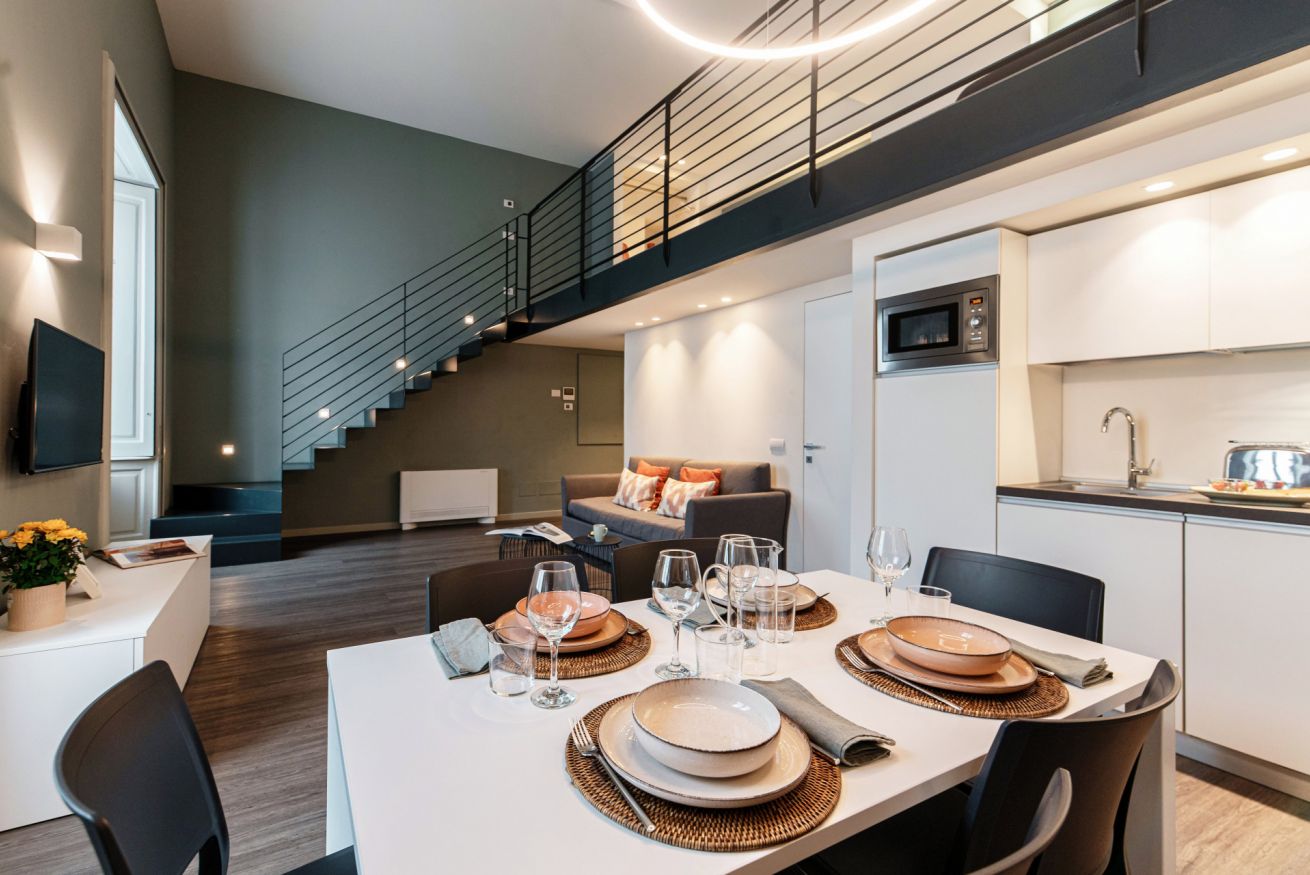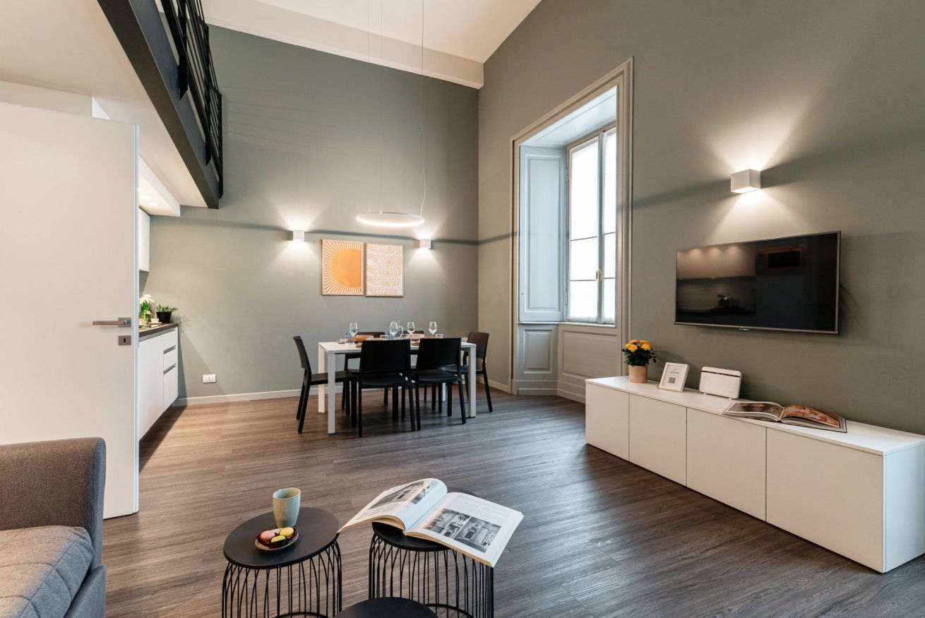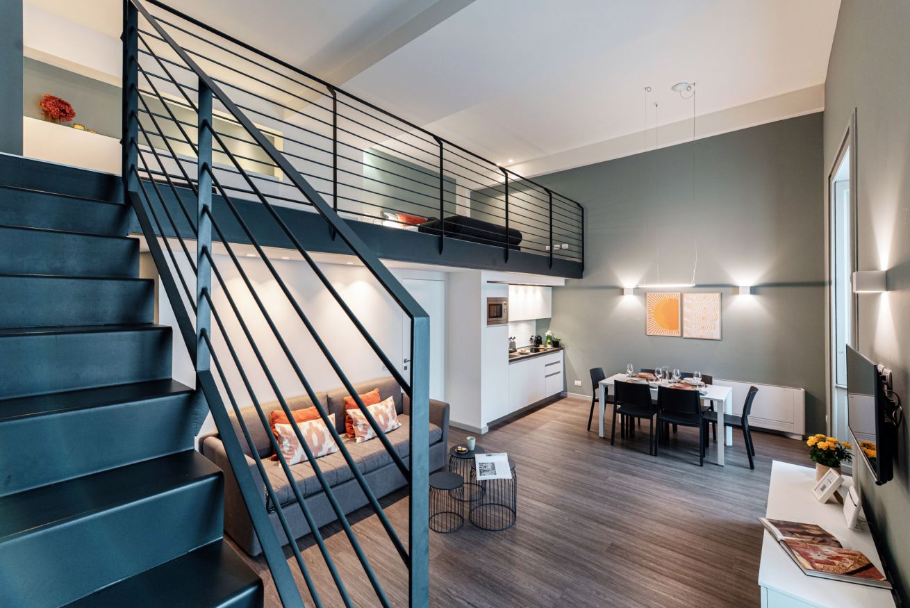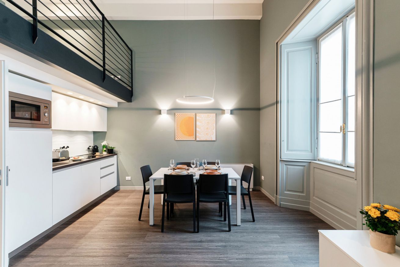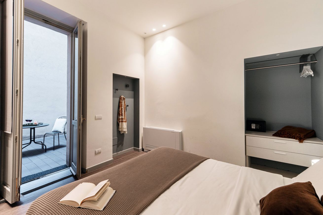 "Suite Broletto" can accommodate up to 6 guests. There are two bedrooms with double beds and a sofa bed in the living area which is shared with an equipped kitchenette. Two bathrooms. The apartment is two-leveled with one bedroom in the loft. There is a small courtyard terrace.