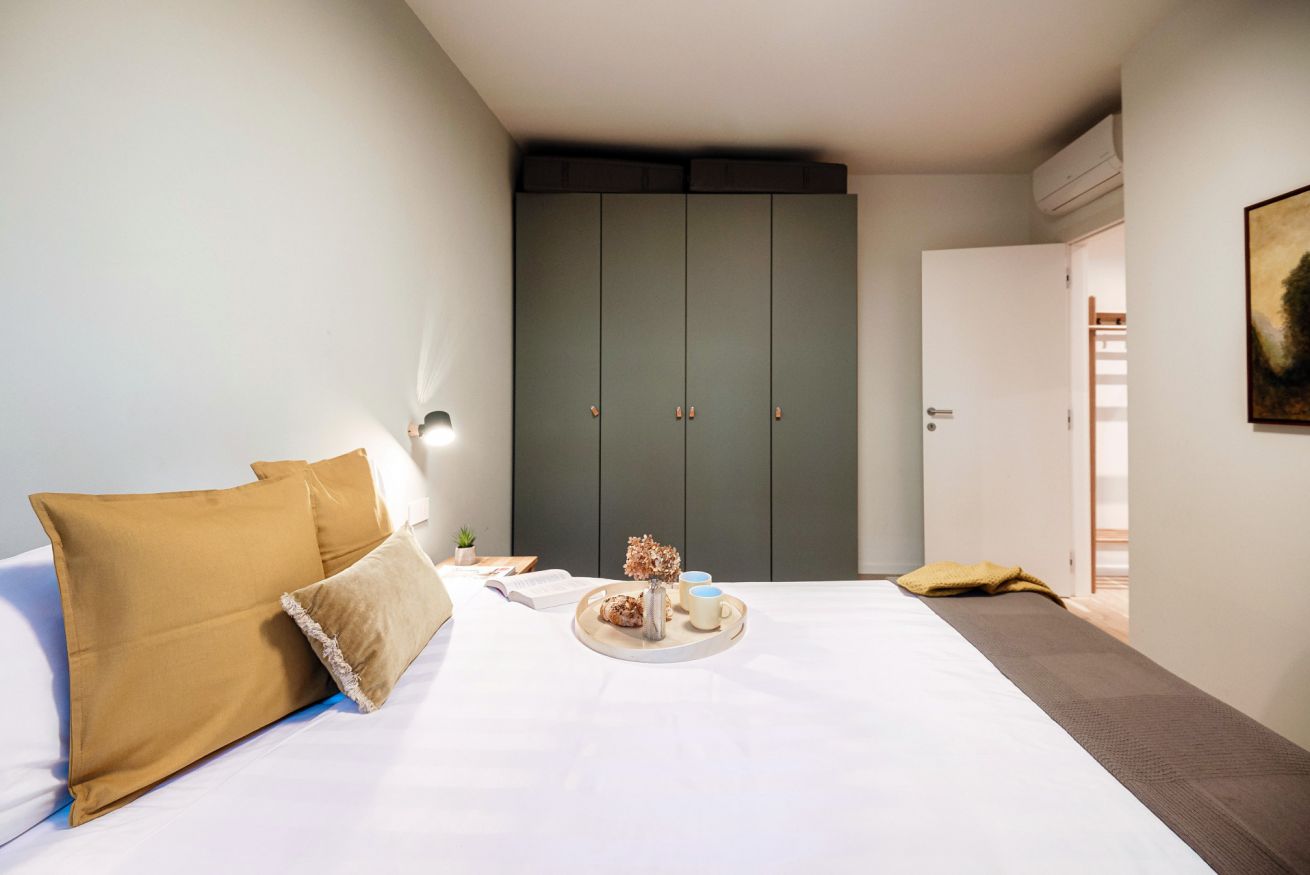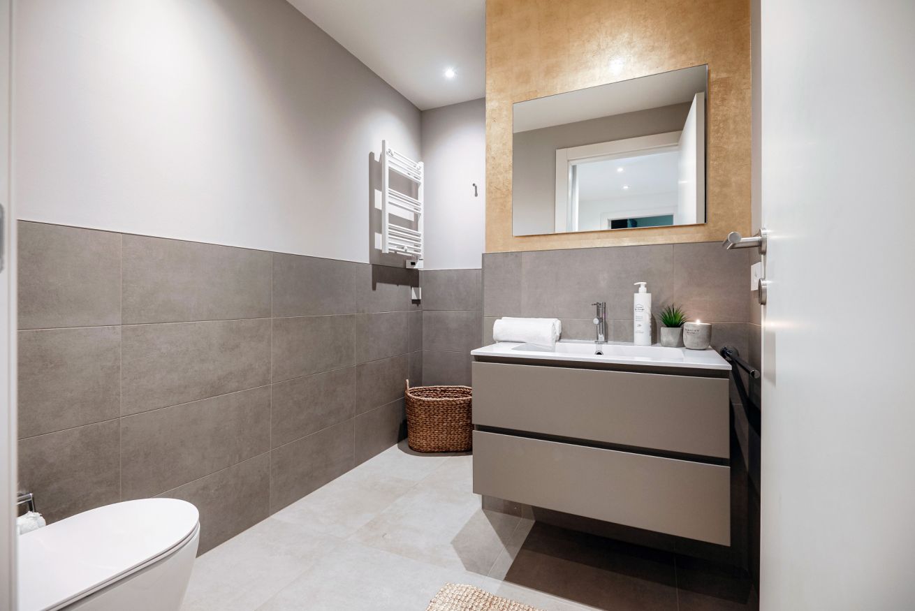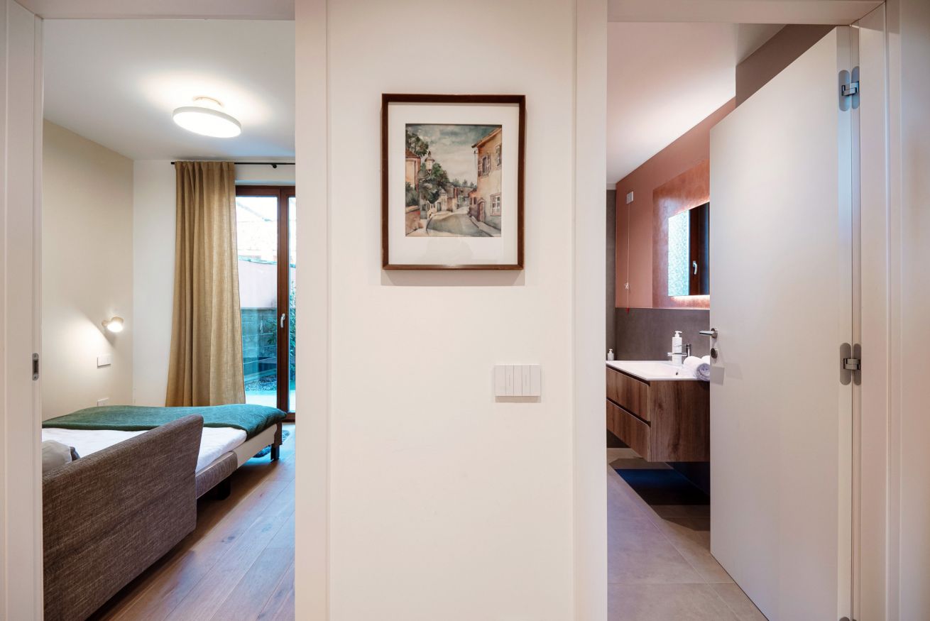 This apartment can comfortably accommodate up to four people, making it suitable for a family or a group of friends. There are two double bedrooms and two bathrooms - one with a shower and one with a tub. The living area includes a modern kitchen equipped with everything you will need - induction cooktop, dishwasher, etc., and a living room with a comfortable L-shaped sofa bed. The apartment also features a washing machine, smart tv and free wi-fi.