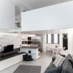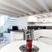 The bedroom is located on the mezzanine level, while the large living room—overlooking the quiet internal courtyard—includes two large sofa beds.