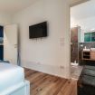 “Just in Front” consists of a living area with free Wi-Fi, a large and well-equipped kitchen for preparing meals independently, four double bedrooms, and four full bathrooms with showers. The apartment can accommodate up to 8 people and is equipped with heating and an air cooling system for air circulation.