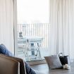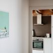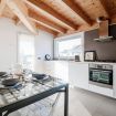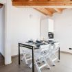 The two rooms can accommodate up to 4 guests: a double bedroom with an extra single bed that also acts as a sofa, and a private bathroom. The second room is equipped with a comfortable single bed, and the second bathroom has a bathtub. The living area is rich in natural light thanks to the large windows and perfectly organized with a double sofa, a bookcase, and a 50-inch flat-screen TV. The large window door overlooks the outdoor terrace from which you can enjoy city views. The kitchen is perfectly stocked, with simple and linear blocks that focus on modern design for both finish and color – an ideal ally for delicious dinners, perhaps with a home chef!