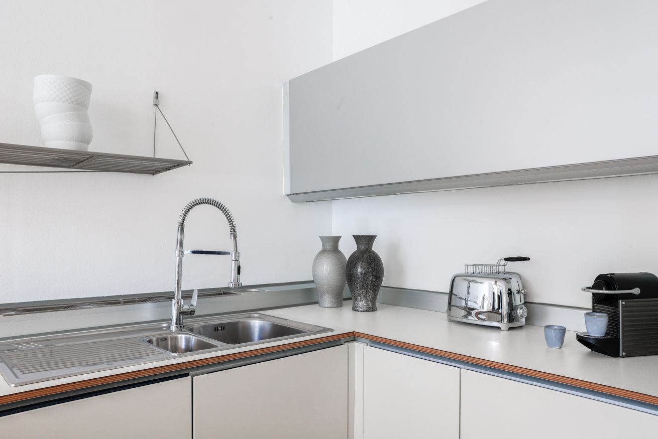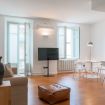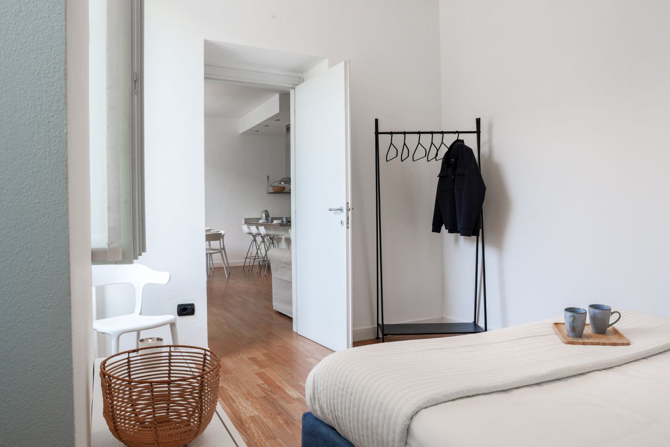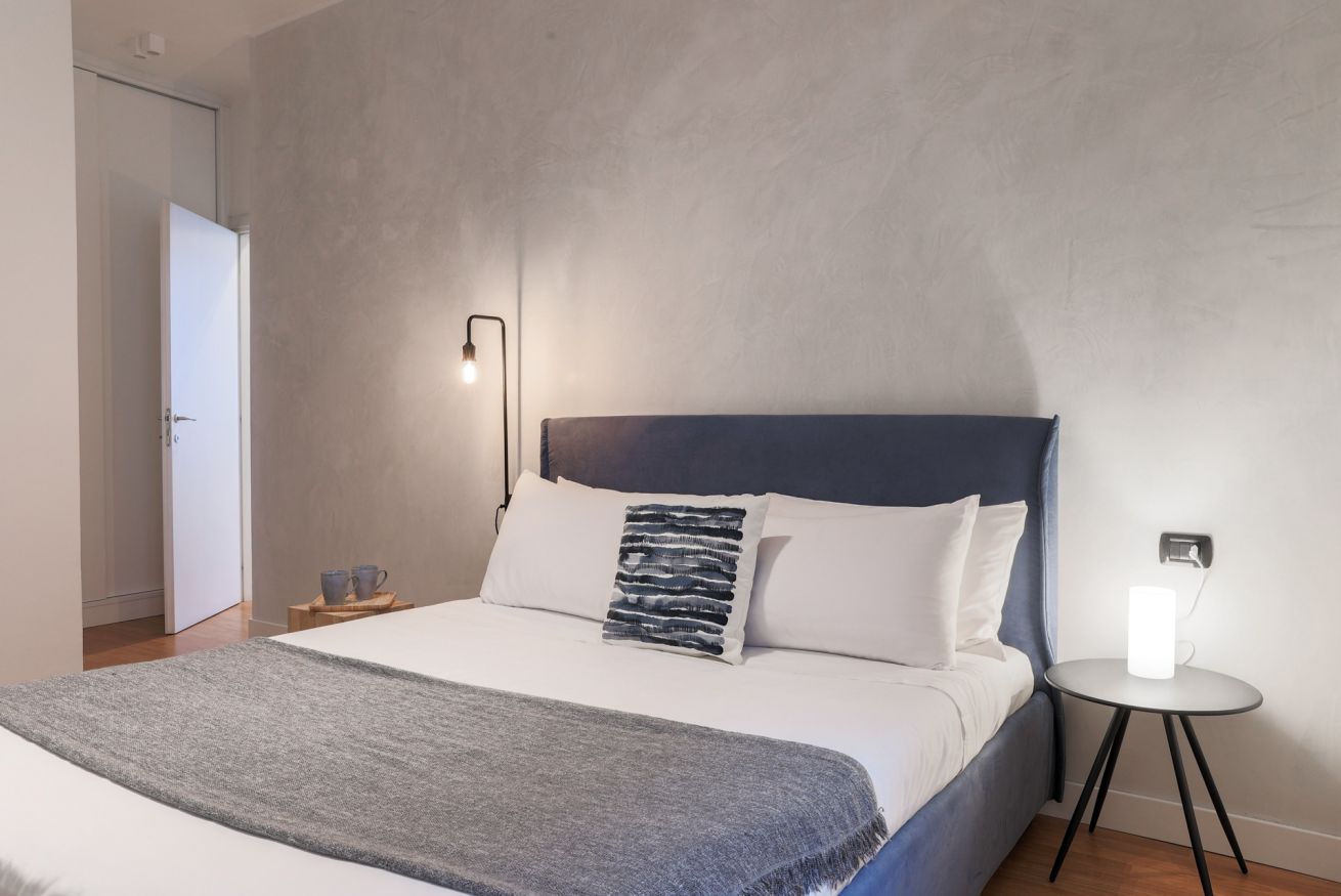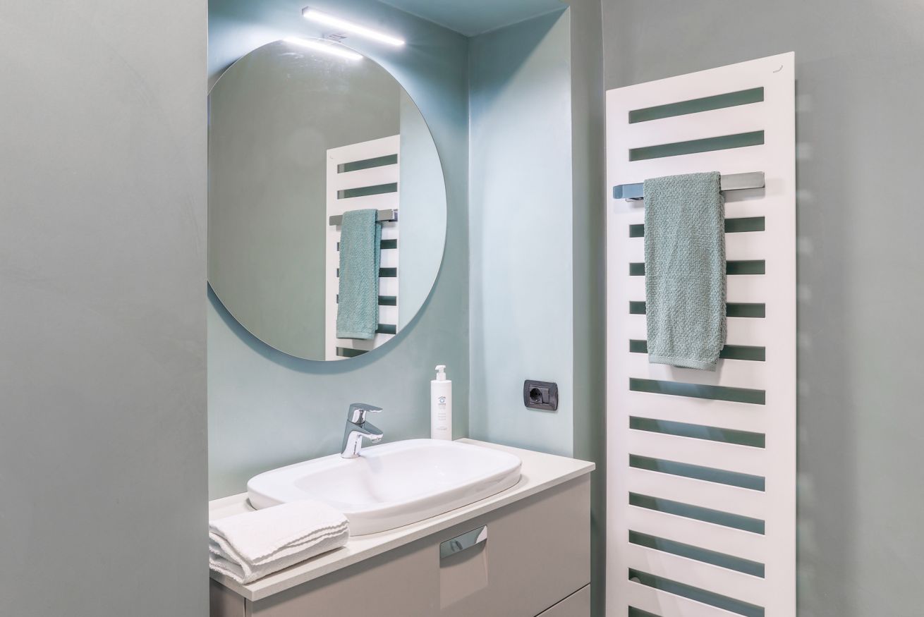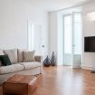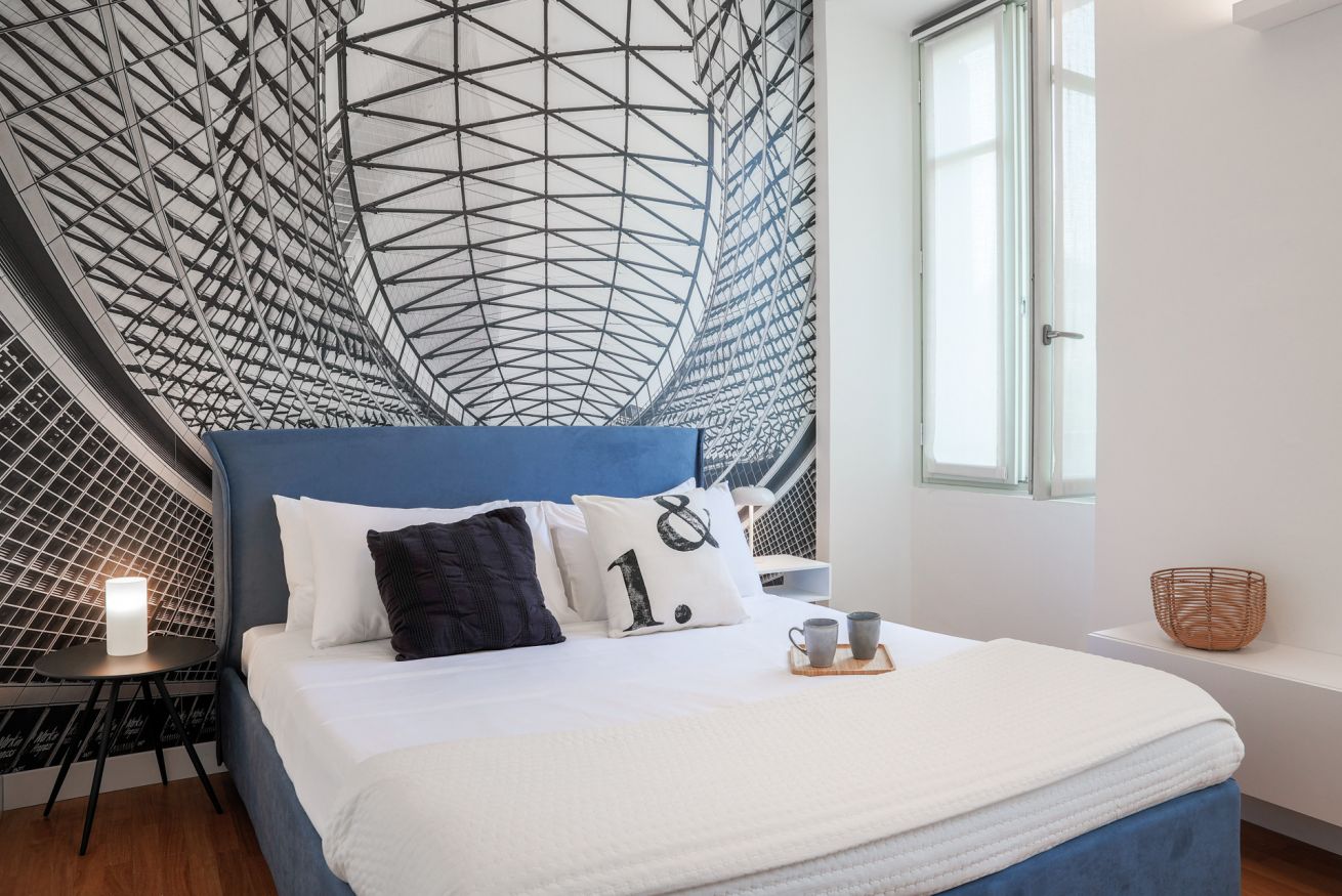 "MG Home" is a cosy and spacious apartment, very close to the famous Piazza Duomo in Como. Thanks to its position and wide windows, MG Home is also a very bright and airy dwelling. You will love the delicate contrast between the light colours of the walls and furnishings and the shiny wood flooring in the wide living area. This recently refurbished flat is furnished with taste and modern design. The big kitchen island, the kitchen range hood, the bar stools, the round table and the sofa make the large living area a comfortable place to spend time. It will certainly appeal to you! Moreover, all the windows and little balcony offer a nice view over the cathedral and its green dome.