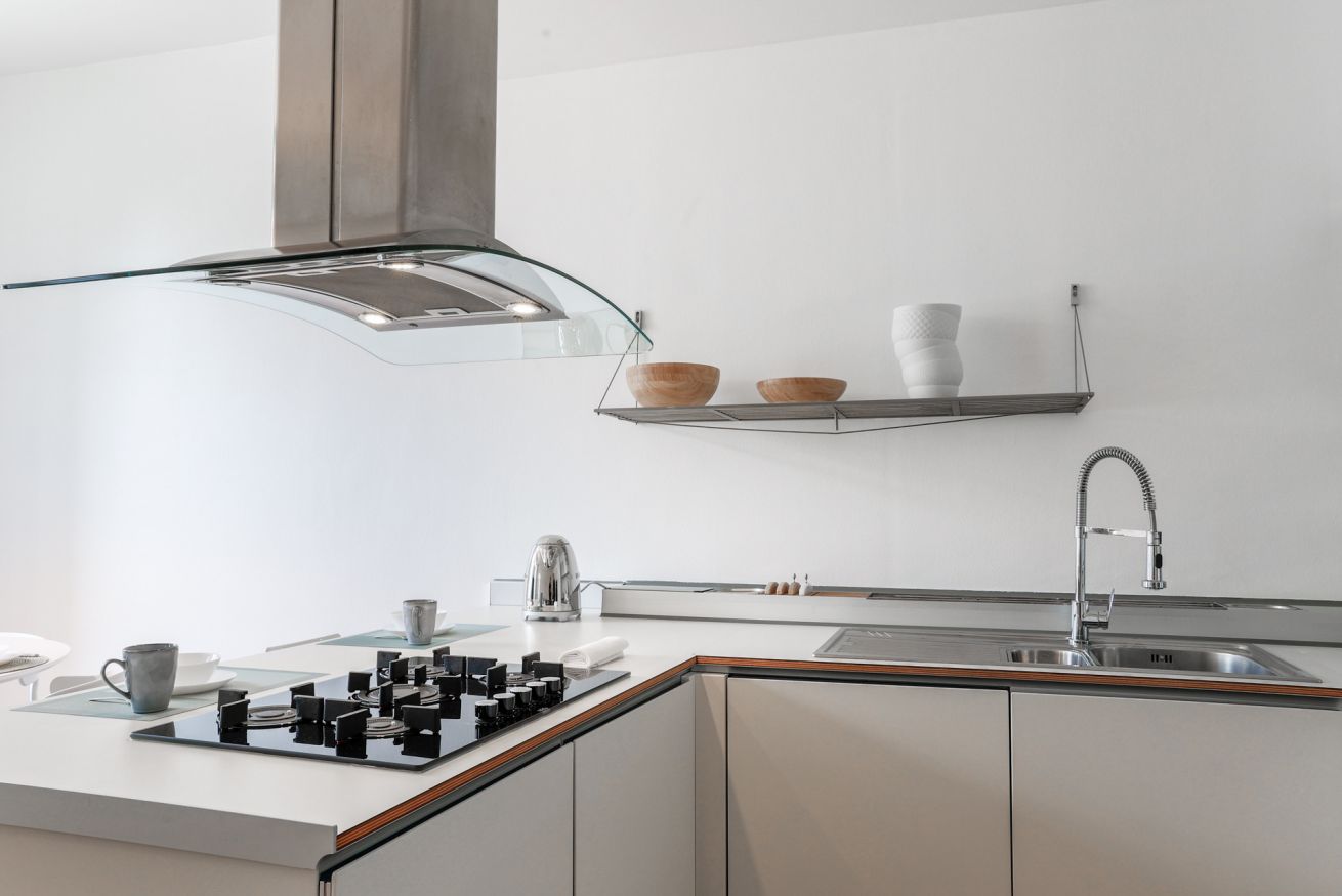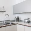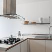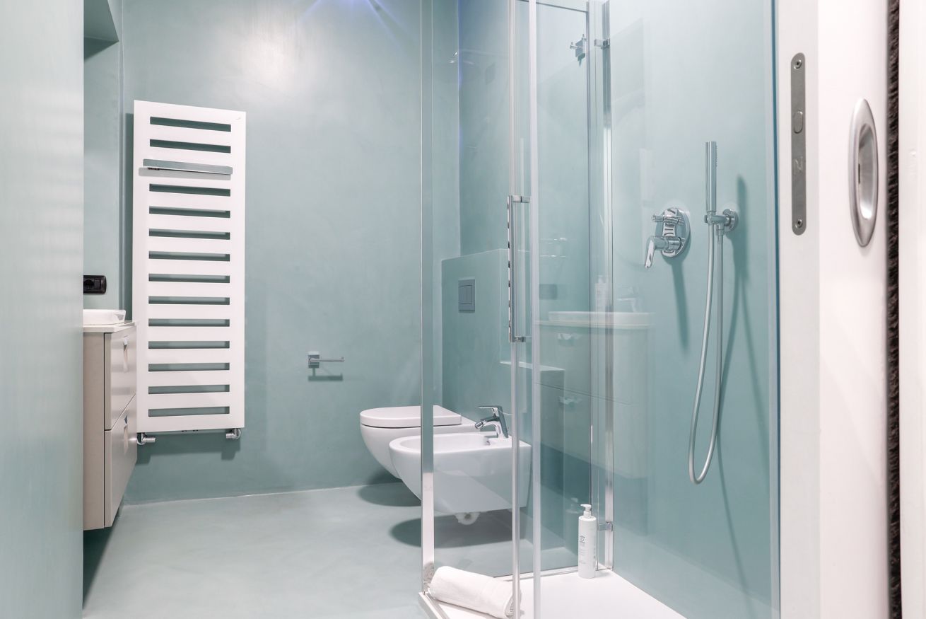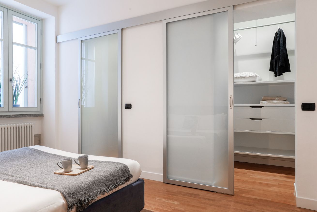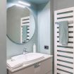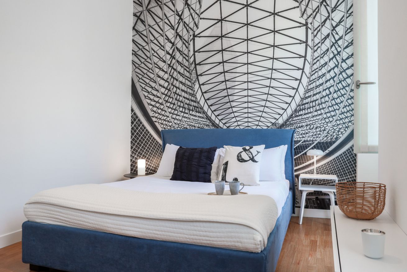 "MG Home" is a cosy and spacious apartment, very close to the famous Piazza Duomo in Como. Thanks to its position and wide windows, MG Home is also a very bright and airy dwelling. You will love the delicate contrast between the light colours of the walls and furnishings and the shiny wood flooring in the wide living area. This recently refurbished flat is furnished with taste and modern design. The big kitchen island, the kitchen range hood, the bar stools, the round table and the sofa make the large living area a comfortable place to spend time. It will certainly appeal to you! Moreover, all the windows and little balcony offer a nice view over the cathedral and its green dome.